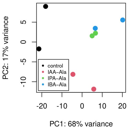 After treatment of B. rapa seedlings with IAA-Ala, IPA-Ala and IBA-Ala, total RNA from two biological replicates was sequenced and analyzed. The read counts per gene were estimated for each replicate and compared to the untreated control. The PCA analysis of read counts per gene and per treatment shows specific groupings for the control and IAA-Ala replicates. When comparing the IPA-Ala and IBA-Ala replicates to the controls and IAA-Ala treatments, the former group closely together, suggesting that there is a general similarity in gene expression following these treatments (Figure 2). After treating B. rapa seedlings with IAA-Ala, IPA-Ala and IBA-Ala, we identified 371, 417 and 807 differentially expressed genes (DEGs), respectively (Tables S1–S3). The number of DEGs did not correlate with the total number of uniquely mapped reads (on average 2.31, 2.09 and 2.27 × 107, respectively). Therefore, IBA-Ala treatment altered the gene expression of almost twice as many genes as IAA-Ala and IPA-Ala treatments, suggesting that it is the strongest effector among the conjugates used.