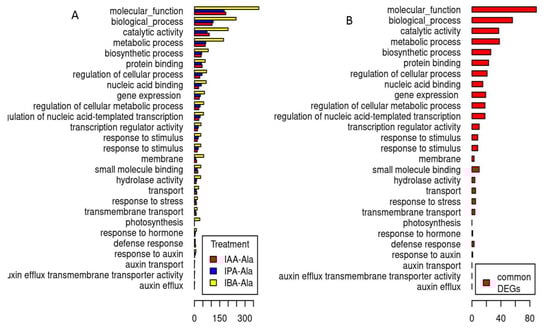 The three treatments differed only partially in the genes they affected. In total, 193 genes were common DEGs, i.e., genes that changed their expression after all three treatments (Figure S3). The changes in gene expression generally had the same direction (activation or repression) after different treatments compared to the control. The distribution of common DEGs across GO categories is similar to the distribution after the three treatments (Figure 3A,B). Overall, there seems to be a remarkable similarity between the effects of IAA-Ala, IPA-Ala and IBA-Ala on gene expression, as well as on the phenotype of B. rapa seedlings. A remarkable number of common DEGs are heat shock and other stress response proteins, a result consistent with the detrimental effects of the treatments on phenotype.