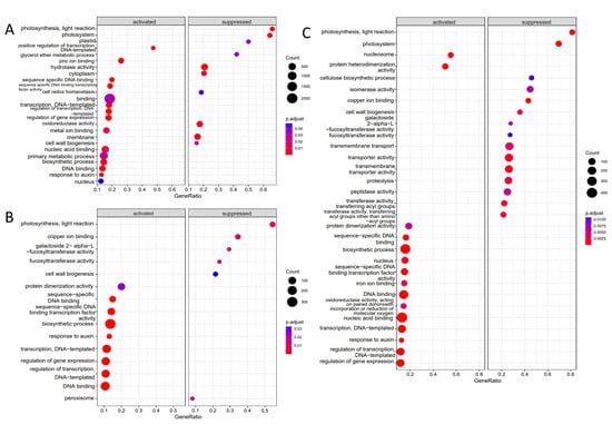 Dotplot showing GO categories that are significantly enriched (GeneRatio > 0.5) or depleted (GeneRatio < 0.5) of DEGs after the IAA-Ala (A), IPA-Ala (B) and IBA-Ala treatment (C) according to the GSEA analysis.