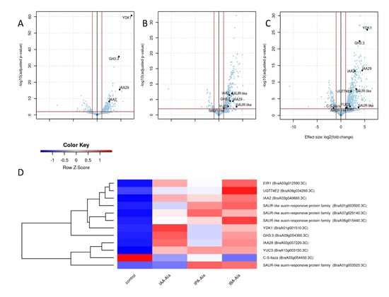 DEGs involved in auxin metabolism. Volcano plot of genes after IAA-Ala treatment (A), IPA-Ala treatment (B) and IBA-Ala treatment (C). Red lines separate genes at the x-axis values that correspond to p-value 0.01 and at the y-axis values that correspond to logFC of 1. The black lines represent the result of a hierarchical clustering of samples by R function heatmap.2. Auxin metabolism-related DEGs are labeled on the treatment volcano plots. Heatmap of (rlog-transformed) read counts for DEGs involved in auxin metabolism (D). Strict mapping of A. thaliana auxin metabolism genes to B. rapa genes was used (BBH, max length difference 0.8, identity > 40%). DEGs involved in auxin metabolism are: YDK1 (BraA01g001510.3C), IAA2 (BraA03g040660.3C), IAA29 (BraA03g057220.3C), GH3.3 (BraA09g054360.3C), SAUR-like auxin-responsive protein family (BraA01g003500.3C), SAUR-like auxin-responsive protein family (BraA01g003520.3C), SAUR-like auxin-responsive protein family (BraA06g015440.3C), SAUR-like auxin-responsive protein family (BraA07g029140.3C), YUC3 (BraA10g003150.3C), EIR1 (BraA03g012590.3C), C-S-lyase (BraA03g054450.3C), UGT74E2 (BraA08g034260.3C).