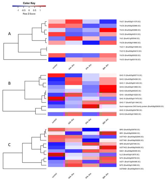 We were particularly interested in how treatments with amino acid conjugates affected auxin-related genes. Volcano plots (Figure 5) show that there are auxin-related genes with significant changes in expression (i.e., DEGs), especially under IBA-Ala, compared to IPA-Ala and finally IAA-Ala treatments. All of the DEGs detected, with the exception of C-S-lyase, were upregulated depending on the treatments, but to varying degrees. A more detailed analysis was performed to compare the effects of the treatments on various YUC genes (Figure 6A), GH3 genes (Figure 6B) and various genes of interest such as UGT, IBR, etc. (Figure 6C). Since there is no information in the literature on the effects of auxin amino acid conjugates on the auxin transcriptome, we analyzed transcriptomic data in A. thaliana after 1 µM IAA treatment available in the database (A. thaliana eFP Browser (http://bar.utoronto.ca/, accessed on 1 June 2022) [,]. The positions of genes in the auxin metabolic pathway and their expression patterns after IAA treatments are shown in Figure 7 to compare these with our data.