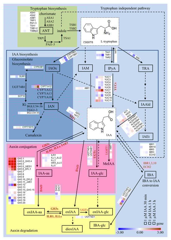 Scheme of auxin homeostasis in A. thaliana by expression of genes involved in early (30 min), medium (1 h) and late response (3 h) to IAA treatment (c = 1 µmol L−1). Microarray data set from AtGenExpress Hormone Series [] for genes involved in auxin metabolism in A. thaliana was used from eFP expression browser []. Model is edited based on the recent data of Hayaski et al. [] and Brunoni et al. []. The expression is presented as log2 fold change. The heat maps were generated with the Morpheus software (https://software.broadinstitute.org/morpheus/, accessed on 1 June 2022).
