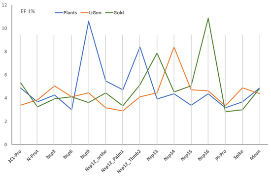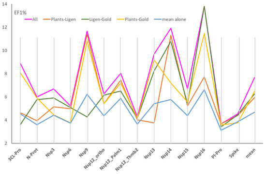 Although they reach comparable EF1% overall means, the docking simulations show similar performances only for two targets (i.e., N-Prot and Pl-Pro). In most cases, a program outperforms, compared to the other two. This situation is particularly remarkable for LiGen with Nsp14, for PLANTS with Nsp9, and for GOLD with Nsp16. The different performances of the three docking engines suggest that they do not depend on an intrinsic complexity of the targets but are mostly related to the implemented docking algorithms.