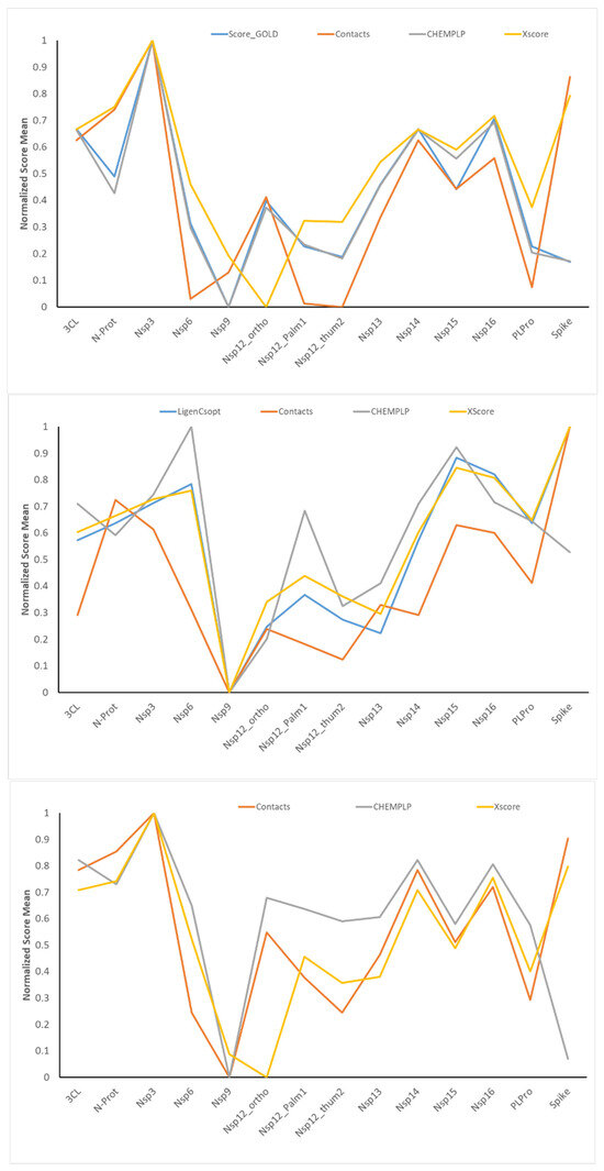 While showing conceivable differences, the score averages reported in Figure 3 reveal some similar trends. For almost all monitored scores, Nsp3 and spike targets reveal the best scores, while Nsp9 shows the worst averages. Also, 3CL-Pro, Nsp14, and Nsp16 exhibit, on average, rather good score values, while Nsp6, Nsp12 (all sites), and Nsp13 exhibit modest score means. There is an encouraging agreement between the score trends and the binding pocket characteristics previously reported [24]. On average, the pockets showing the best score averages are characterized by either large pockets (as in the case of spike, 3CL-Pro, and Nsp14) or remarkable interaction capacities (as in the case of Nsp16 and Nsp3). In contrast, small or superficial pockets with reduced interacting features yield poor score values (as in the case of Nsp9 and, to a minor extent, PL-Pro).
