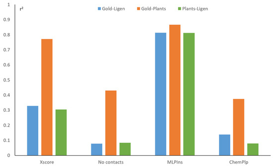 Cross-target correlation (r2) averages for some representative scoring functions from the three utilized docking tools. The primary scores correspond to ChemPLP, CSopt, and GOLD_Score for PLANTS, LiGen, and GOLD, respectively. Notice that ChemPLP was also utilized to rescore the computed poses by LiGen and GOLD.