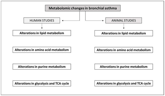 Bronchial asthma is an extremely heterogenous chronic respiratory disorder with several distinct endotypes and phenotypes. These subtypes differ not only in the pathophysiological changes and/or clinical features but also in their response to the treatment. Therefore, precise diagnostics represent a fundamental condition for effective therapy. In the diagnostic process, metabolomic approaches have been increasingly used, providing detailed information on the metabolic alterations associated with human asthma. Further information is brought by metabolomic analysis of samples obtained from animal models. This article summarizes the current knowledge on metabolomic changes in human and animal studies of asthma and reveals that alterations in lipid metabolism, amino acid metabolism, purine metabolism, glycolysis and the tricarboxylic acid cycle found in the animal studies resemble, to a large extent, the changes found in human patients with asthma. The findings indicate that, despite the limitations of animal modeling in asthma, pre-clinical testing and metabolomic analysis of animal samples may, together with metabolomic analysis of human samples, contribute to a novel way of personalized treatment of asthma patients.