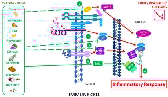 Nutraceuticals have demonstrated their effectiveness in regulating the heightened inflammatory response characteristic of allergic reactions. This approach involves intervention in the signaling pathways activated in this type of response, either using nutraceuticals independently or in combination with conventional medications. This strategy presents an attractive opportunity to induce significant alterations in allergy-related immunocellular properties (Table 1). The signaling pathways modulated by nutraceuticals primarily encompass nuclear factor erythroid 2-related factor 2 (Nrf2), mitogen-activated protein kinases (MAPK), and nuclear factor kappa-light-chain-enhancer of activated B cells (NFκB) (Figure 1).