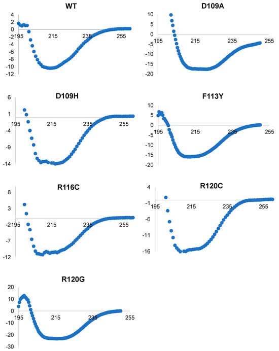 2.1. Circular Dichroism Spectroscopy Identifies Alterations in Secondary Structure Arising from ACD Mutations