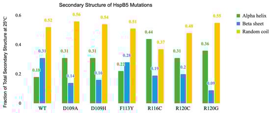 Several salt bridges form between β-sheets in the ACD, including R120, previously determined to form a salt bridge with D109. The mutation R120G has been identified as an inherited mutation linked to cataracts and myopathies [,,] and results in decreased β-sheet character, while both random coil and α-helix character are increased as the mutation introduces a small, hydrophobic, and flexible residue at this position (Figure 3). R120C reduces total β-sheet composition compared to that of HspB5; however, the reduction is tempered compared to that with R120G. However, while R120C retains some β-sheet character, there is a large overall increase in α-helical character that suggests the dimer interface and subsequent overall protein structure have been significantly altered.