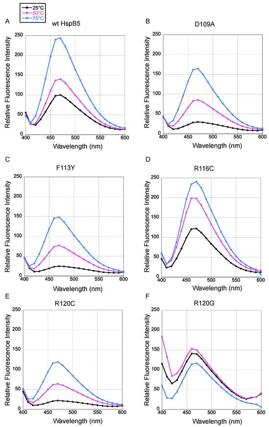 Spectra for the various temperatures were evenly delineated for HspB5, D109A, F113Y, R116C, and R120C, with the spectra merging as the emission wavelength increased toward 600 nm. The spectra for R116C overlapped when the emission wavelength increased from 410 nm to 450 nm at 50 °C and 75 °C, with a larger transition occurring between 25 °C and 50 °C, compared to HspB5. Overall, R116C ANS fluorescence was most similar to that of HspB5, indicating that the solvent exposed the residues and the protein stability of this mutation may be the least perturbed compared to that of wildtype in terms of hydrophobic accessibility by ANS. D109A and F113Y demonstrated a general attenuation in relative fluorescence at all temperatures, which suggested an altered structure compared to that of HspB5 and may indicate that fewer solvent-exposed hydrophobic regions of the protein were available to bind ANS [].