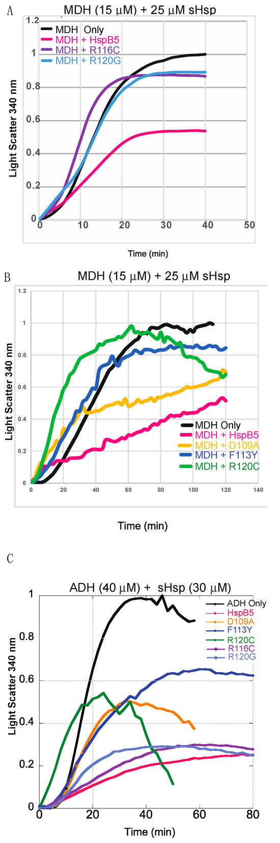 Chaperone aggregation assays for heat-denatured substrates, ADH and MDH. Light scatter for each substrate in the presence of a chaperone at 340 nm was plotted relative to substrate light scatter in the absence of a chaperone. Aggregation was monitored for 90 min at 55 °C. (A) MDH only and MDH mixed with HspB5, R116C, and R120G chaperones. Chaperone activity and substrate aggregation were measured at 55 °C for 2 h. (B) MDH and HspB5 chaperones. (C) ADH and HspB5 chaperones. Chaperone activity and substrate aggregation were measured at 55 °C for 1.5 h for ADH. The data are averages of ≥3 replicates. The data were normalized based on maximum absorbance. In the absence of substrate proteins, chaperones do not aggregate, Figure S1.