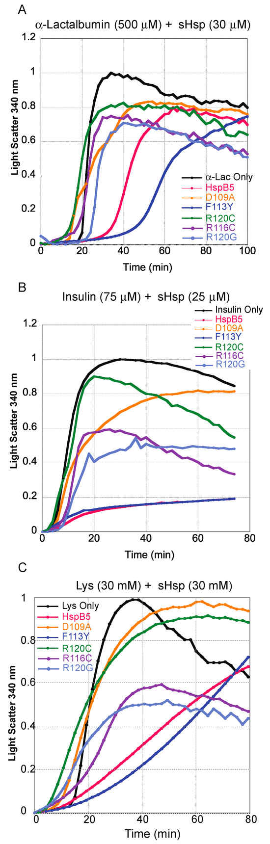 To investigate the impact the mechanism of substrate aggregation would have on the chaperone capacity of HspB5 and mutations, three chemically denatured substrates were compared using in vitro chaperone-like assays. The substrates, α-lactalbumin (α-lac), lysozyme (Lys), and insulin, were denatured with DTT. Each substrate in the absence of a chaperone was used as a positive control, and all mutations were compared to HspB5.