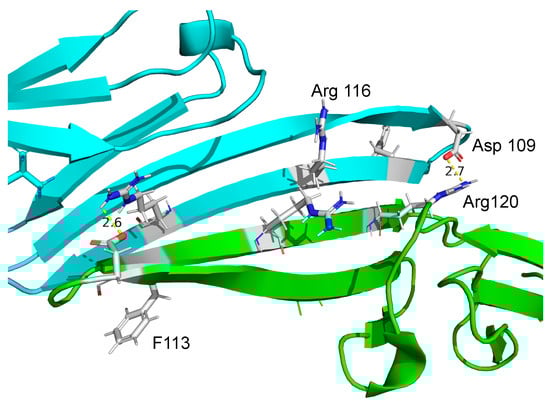 The α-crystallin domain (ACD) dimer interface characterized from HspB5 oligomers using solid state NMR, pdb 2KLR []. Residues forming key electrostatic interactions are shown. The salt bridge between D109-R120 is indicated as 2.6–2.7 . Other sites of mutagenesis, Arg 116 and F113, are indicated, illustrating their central positions within the interface. Distances were calculated in PyMOL (The PyMOL Molecular Graphics System, Version 2.0 Schrödinger, LLC (New York, NY, USA).).