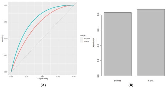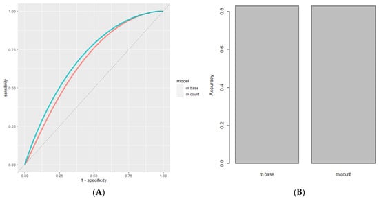 Feature engineering. (A) ROC Curve of Base Model Using Stochastic Gradient Boosting (Red, AUC = 0.674) compared to model after adding the COUNT feature (Cyan, AUC = 0.702). (B) Accuracy of Base Model Using Stochastic Gradient Boosting (Red, Accuracy = 0.829) compared to model after adding the COUNT feature (Cyan Accuracy = 0.829).