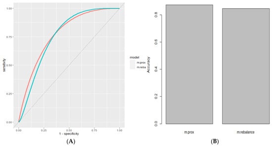 Handling class imbalance. (A) ROC Curve of Model Using Stochastic Gradient Boosting with outliers removed (Red, AUC = 0.80) compared to same model with class rebalancing (Cyan, AUC = 0.812). (B) Accuracy of Base Model after outlier removal (Red, Accuracy = 0.872) and after class rebalance (Cyan, Accuracy = 0.846).