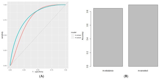 Using variable importance to select predictors. (A) ROC Curve of Model Using Stochastic Gradient Boosting with class rebalance (Red, AUC = 8.12) compared to same model with variable selection for the top 8 variables (Cyan, AUC = 0.829). (B) Accuracy of Base Model after classrebalance (Red, Accuracy = 0.846) andafter variable selection (Cyan, Accuracy = 0.897).