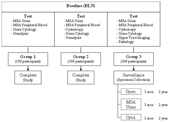 The prospective study was designed to determine the efficacy of the panel of MSA markers for the detection of bladder cancer and bladder cancer recurrence using the developed clinical MSA assay [,], and more than 10 different institutes from the US and Canada participated in this study. Three groups of different patient populations were sampled for this study, as outlined in the Materials and Methods section.