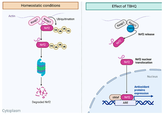 Homeostatic conditions of Nrf2–Keap1 and the proposed effect of TBHQ on the Nrf2–Keap1 pathway. Image created from BioRender.com.