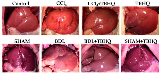 Livers were observed in situ (Figure 3), and healthy control groups (Control, TBHQ, SHAM, and SHAM+TBHQ) presented a uniform and smooth surface with soft consistency on palpation. Additionally, livers in the BDL group showed an altered appearance with a pale surface, while the CCl4 group presented an altered hepatic morphology with a necrotic appearance. The gross appearance of the livers from the CCl4+TBHQ and BDL+TBHQ groups showed a less damaged appearance compared to the damage groups (CCl4 or BDL, respectively).