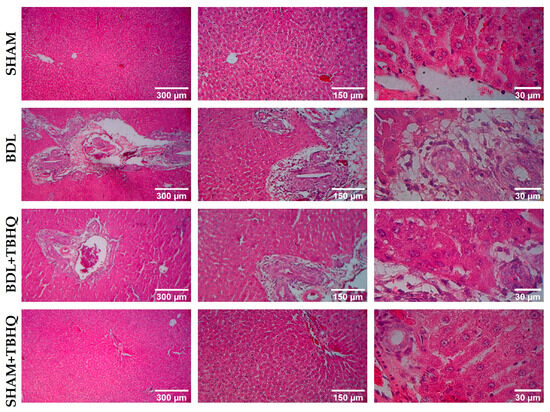 H&E staining showed that two days after surgery, the BDL group presented liver necrosis, with a loss of normal architecture of the liver cords and infiltration of inflammatory cells with marked proliferation of the bile ducts. However, treatment with TBHQ prevented acute liver damage induced by BDL, since the BDL+TBHQ group showed little infiltration of inflammatory cells and mild proliferation of the bile ducts, as well as less hepatic necrosis and preservation of cell integrity, which can be compared to that of the healthy groups (Figure 5).