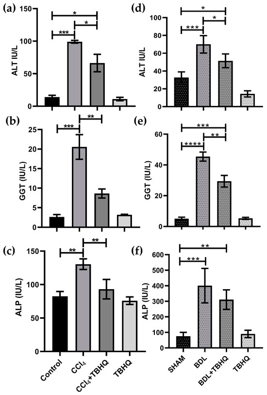 Evaluation of serum markers for liver damage. (a,d): ALT; (b,e): GGT; (c,f): ALP. CCl4 model (a–c): Control, CCl4: CCl4 (1.6 g/kg, i.p.), CCl4+TBHQ: CCl4 (1.6 g/kg, i.p.) + TBHQ pretreatment and TBHQ groups BDL model; (d–f): SHAM: SHAM surgery; BDL: bile duct ligation; BDL+TBHQ and SHAM+TBHQ groups. Results were expressed as the mean ± SE. Statistically significant differences: (*) p < 0.05, (**) p < 0.01, (***), p < 0.001, and (****) p < 0.0001.