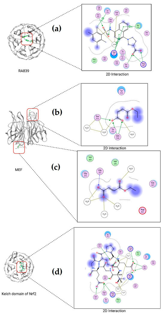 Three-dimensional and two-dimensional interaction diagrams. Keap1 with (a) RA839, (b,c) MEF, and (d) the Kelch domain of Nrf2.