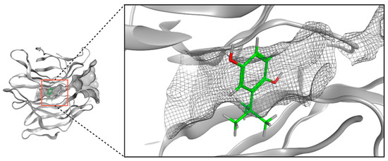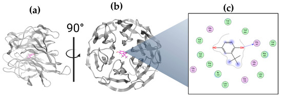 The bioactive effect of TBHQ is attributed to the induction of phase II drug-metabolizing enzymes through a dependent pathway of nuclear factor erythroid 2-related factor 2 (Nrf2), which is a member of the basic leucine zipper transcription factor (bZIP), regulated mainly by Kelch-like ECH-associated protein 1 (Keap1) [13]. Keap1 is an adapter substrate of the Cullin–RING E3 ubiquitin ligase complex, which suppresses Nrf2 in the cytoplasm by sequestration, ubiquitination, and proteasomal degradation [14]. Under the stimulus of reactive oxygen species (ROS) or electrophilic agents, the hyperreactive cysteine residues of Keap1 allow the inactivation of the E3 ubiquitin ligase, and Nrf2 is dissociated from Keap1. Nrf2 accumulates in the cytoplasm and travels to the nucleus to mediate cytoprotective gene expression through antioxidant-responsive elements (AREs). The Keap1 protein contains a domain called BTB (bric-a-brac) that mediates dimerization, another domain called the IVR (intermediate region) domain that is involved with the interaction with CUL3, and a joint domain called DC composed of the individual domains DGR (double glycine repeat) and CTR (carboxyl-terminal region). In this DC domain, the interaction with Nrf2 occurs. On the Nrf2 protein, there are DLG and ETGE motifs in the section called Neh2 (amino end) that interact with the DC domains of the Keap1 homodimer [15,16]. Therefore, another objective of the present study was to analyze the interaction between TBHQ and Keap1 in silico (Figure 2).