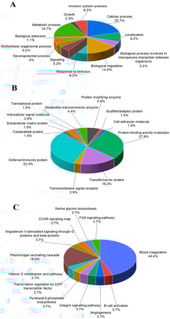 Gene ontology analysis of the proteins identified in human follicular fluid. Proteins were classified according to (A) biological processes, (B) protein classes and (C) pathways involved. Results are displayed as percentage of proteins classified to a category over the total number of class hits.