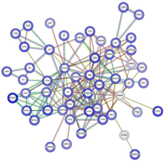 Proteins with many connections are called hub proteins, which are quite often crucial in the network. These hub proteins play important roles in biological systems and are usually involved in multiple interactions, making them crucial for maintaining the network’s structure and function, and these proteins may be targeted for further investigations as they are likely to be involved in critical biological functions. Node degree is the number of connections or interactions that a certain protein has with other proteins in the network. In Table 2, the node degrees of proteins in our network are shown. In our study, ALB had a high node degree meaning that this protein interacted with 27 other proteins, making it a hub protein. Another hub protein was ApoA1 that interacted with 18 other proteins.
