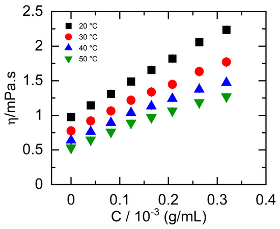 When a xanthan gum macromolecule assumes a random coil structure, the dissociation of the side chains from the backbone allows XG chains to interact with each other or other polymer chains, which leads to the formation of a network structure [8]. The network structure forms because of the contribution of intermolecular and electrostatic interactions [6]. However, XG solution structure depends on various factors such as pH, temperature, salt concentration, and others. Brunchi et al. [9] investigated XG viscosity (molecular weight 1.165 × 106 g/mol, 0–0.04 g/dL, at 25 °C) in 0.01–300 mM NaCl or KCl in water. They found small differences (~10%) between the [η] values in water and low salt concentrations because the repulsion forces were still effective. The increased Na+ and K+ cation concentrations screen the charged groups on XG chains in aqueous solutions, and as the screening of electrical charges continues, the XG chains shrink. The screening effect reduces the electrostatic repulsion between charged groups and leads to a more compact conformation and reduction in the hydrodynamic volume of the XG macromolecule. The [η] was determined using semi-empirical equations proposed by Rao and Wolf and yielded more accurate results than the Huggins model. The [η] decreased by ~74% and ~75% in the presence of 300 mM NaCl and KCl solution compared to water because of the enhancement of the non-Coulombic interactions [9].