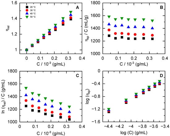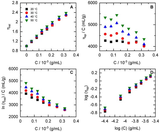 XG concentration dependence of zero-shear viscosity in water for: (A) relative viscosity (ηrel, Equation (4)); (B) reduced viscosity (ηsp/C, Equation (3)); (C) inherent viscosity (ln(ηrel)/C, Equation (2)); and (D) specific viscosity (log(ηsp), Equation (7)). In all panels, black symbols (■) are 20 °C, red symbols (●) 30 °C, blue symbols (▲) = 40 °C, and green symbols (▼) = 50 °C. The error bars are from relative standard deviations and within the symbols’ size.