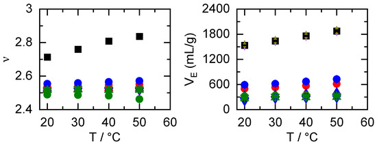 Further, we computed the voluminosity (VE) and shape factor (ν) to characterize the XG shape in plain water, Figure 3. A decreased VE indicates a reduction in the solvation of the XG molecules. VE was 22% higher at 50 °C compared to 20 °C and indicated that solvent quality improved with increasing temperature, which is common in salt-free polyelectrolyte solutions. Shape factor was also computed, and our data shows a constant value of 2.5 at all temperatures, consistent with the literature reports and further supporting a spherical conformation [12,27,28]. The XG hydrodynamic coil radius showed linear dependence and increased by 9% over our temperature range. With the lack of literature precedent for XG coil radii behavior, we used nonionic dextran (T2000, 2 × 106 g/mol) as a comparator. While the dextran coil radius decreased by 4% with an increased temperature from 20 °C to 40 °C, in contrast, the XG radius increased by 7% [29]. The dextran structure appears to shrink with temperature whereas XG expands. Likely, the nonionic/anionic differences are the motifs that account for these opposite behaviors. In addition, XG has a smaller gain in solution entropy from its counterion interactions with water, which may also account for the larger XG coil [30]. At higher XG concentrations, chains intermingle by gaining entropy of dissociated counterions, changing the nature of the Coulombic repulsion between charged groups [31]. As the temperature rises to 40 °C, the zero-shear viscosity change seems to be suggestive that the conformation is transforming into one resembling a disordered conformation, resulting in a greater degree of XG flexibility compared to dextran.