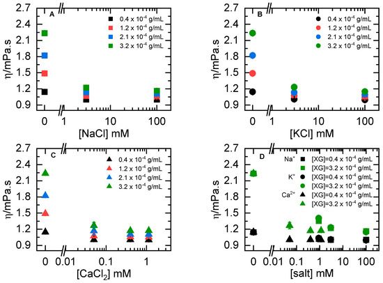 Having examined the impact of temperature on XG in water, we sought to assess the effect of ionic strength through salt addition. Our interests here were to consider which parameter may be more impactful to XG solution behavior—temperature or salt or a synergistic effect of both. It is also of relevance to practical applications to analyze the influence of salt-containing solutions on the structure of XG. For example, XG finds many applications in various industries such as food, pharmaceutical, and oil and gas extraction where salt concentration and temperature vary [15,16,17]. Thus, studying how these factors affect XG’s performance can help optimize product formulation and process design. This is important to ensure XG’s effectiveness in different system conditions. Given that XG is an anionic polyelectrolyte, the presence of ions in solution are expected to influence structural organization by screening the charged side-chain moieties. This screening effect should result in the formation of a compacted XG structure and be manifested by a decreased measured zero-shear viscosity in the presence of salt compared to water. Figure 4 presents our dynamic viscosity data for varying [XG] as a function of salt concentration, by cation type in Figure 4A–C.