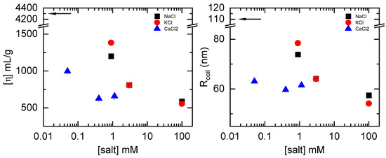 Intrinsic viscosity (left panel) and hydrodynamic coil radius (right panel) of XG in aqueous solutions of NaCl (■), KCl (●), and CaCl2 (▲) at 20 °C. Arrows indicate the values at zero salt concentration. Error bars are from relative standard deviations and typically smaller than the symbols.
