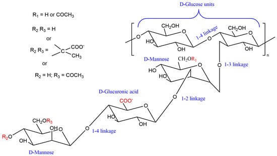The primary structure of XG [4,5] and the type of substitution at the outer mannose unit affects the stability of XG conformation. The chemical structure of XG comprises a linear (1 → 4) linked β-D-glucose backbone with a pendant trisaccharide side chain attached to every second glucose unit at the C3 position [5]. The xanthan macromolecule side chains have two mannose residues, one of which may contain either the carboxylic or acetyl group and one the glucuronic acid residue containing the pyruvate group. The content of the acetyl and pyruvate functional groups of xanthan gum chains are affected by bacterial strain and fermentation processes [6]. These functional groups make xanthan gum an anionic polysaccharide [7]. In a salt-containing solution, the side chains wrap around the backbone of the chains, preventing the β-(1-4) linkage from breaking.