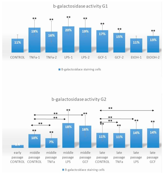 Impact of long-term and short-term exposure of HGFs to several pro-inflammatory signals (TNFa, LPS, GCF) on β-galactosidase activity. Percentage of SA-β-gal-positive HGFs cells exposed short-term at late-passage G1 (TNFa-1 = 0.1 μL/mL, TNFa-2 = 1 μL/mL, LPS-1 = 0.2 μL/mL, LPS-2 = 1 μL/mL, GCF-1 = 5 μL/mL, GCF-2 = 10 μL/mL, EtOH-1 = 100 mM, EtOH-2 = 500 mM) and long-term, from early to late passages, G2 (TNFa = 1 μL/mL, LPS = 0.2 μL/mL, GCF = 10 μL/mL) to pro-inflammatory signals. Values are mean (±SD) of HGFs (experiments repeated three times in duplicates). Asterisks indicate statistically significant differences (** p < 0.01) between control group (G1) vs. all the signals groups and early control group (G2) vs. middle and late passages for each signal separately. The horizontal double arrows indicate statistically significant differences between HGFs expanded in the same passage group. Statistical analyses were performed by two-way ANOVA followed by Tukey’s post hoc tests.