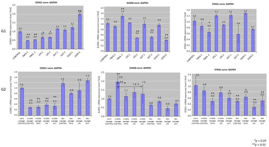 Real-time polymerase chain reaction (PCR) analysis of the expression of senescence-related genes, including CCND1, SUSD6, STAG1 in HGFs cultures exposed to several pro-inflammatory signals, including LPS, TNFa, and GCF. Human Gingival Fibroblasts (HGFs) without treatment were used as controls and GAPDH as the housekeeping gene for this assay. EtOH was used at G1 setup as positive control group. Real-time PCR values are means ± standard deviations of three independent setups in duplicates (* p < 0.05, ** p < 0.01 compared with control untreated cultures). The double arrows (G2) indicate statistically significant differences between groups expanded in the same passage.