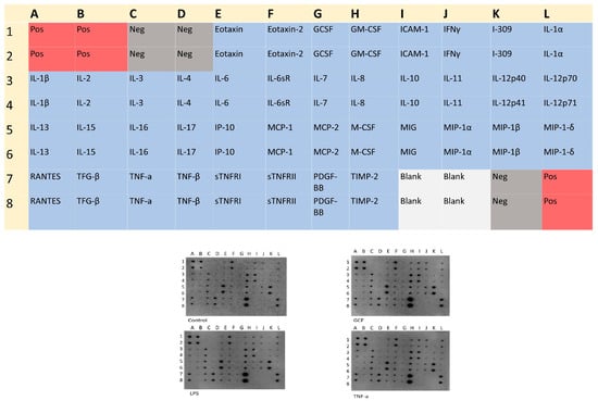 Human Inflammation Antibody Array Membrane Map of 40 inflammatory factors and the corresponding dot blots in each exposure pro-inflammatory signal (GCF, LPS, TNFa) compared to the control group. Letters and numbers on the dot plot correspond to the inflammatory factors shown in the map above.