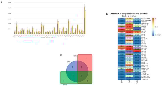 (a) Semi-quantitative analysis of SASP-marker expression by Image J. After normalization to positive control signal intensities, the comparison of the relative expression levels, analyte-by-analyte, among the groups followed. By comparing these signal intensities, the relative differences in cytokine expression were determined in each sample. (b) Heat-map of the ANOVA-adjusted p-values for pairwise comparisons between GCF, LPS, and TNFa vs. control. (c) Number of statistically significant proteins (adj. p-value ≤ 0.05) overlapping in GCF, LPS, and TNFa experiments (* p < 0.05, ** p < 0.01).