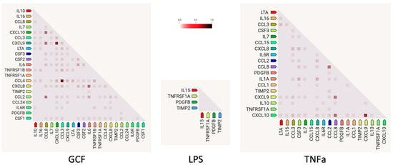 Gene co-expression analysis (Figure 5) shows the level of confidence that two proteins are functionally associated, given the overall gene expression data in humans. Based on the RNA-expressing levels in humans, the higher co-expression score was observed for the pairs CCL3-CCL4 (score: 0.974) for the GCF- and CXCL9–CXCL10 (score: 0.848) for both GCF- and TNFa groups.