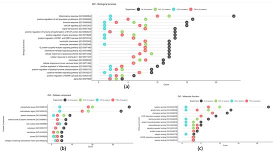 Most frequent gene ontology terms among statistically significant GCF, LPS, and TNFa proteins based on the biological process (a), cellular component (b), and molecular function (c) GO terms.