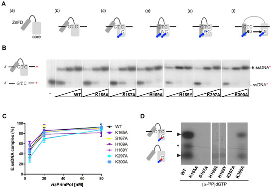 The mechanism of DNA primer synthesis by HsPrimPol involves a number of consecutive steps, including the binding of ssDNA, metals and nucleotides, and the conformational changes required for the initiation of primer synthesis and further maturation [11,27,28]. Thus, HsPrimPol (a scheme of the AEP core and the ZnFD is shown in Figure 2A(a)) firstly forms a binary complex (enzyme:ssDNA) with ssDNA, without metal requirements or the involvement of the ZnFD [11] (Figure 2A(b)). Firstly, the capacity to form an enzyme:ssDNA binary complex was measured in all HsPrimPol mutants using an EMSA assay, as described [11]. As shown in Figure 2B, this binary complex migrates more slowly compared to the free ssDNA in a native polyacrylamide gel, producing a retarded band. It is worth noting that any change in the electrophoretic mobility of the binary complex formed with the mutant PrimPols could reflect an alteration in their tridimensional structure, or a significant change in the interaction with ssDNA. Figure 2B,C shows that all mutants formed an enzyme:ssDNA complex similar to the WT in both mobility and in the enzyme concentration required, meaning that the ssDNA-binding affinity of these mutants was not altered. This also demonstrates that none of the mutants (K165A, S167A, H169A, H169Y, K297A and K300A) have a remarkably altered structural conformation. Moreover, these results underline that motif B and motif C are probably not required for ssDNA binding, in agreement with Rechkoblit and coworkers [22], who proposed that the Module N-terminal of the catalytic core (ModN) is responsible for the main template interactions, a proposal supported in further work [29].