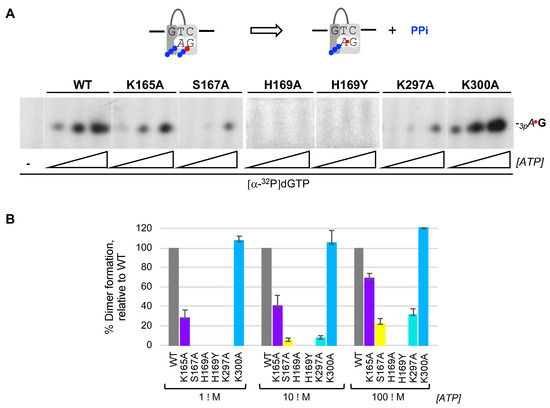 Once the pre-ternary complex (enzyme:ssDNA:dNTP) has been formed, a ribonucleoside triphosphate can occupy the neighbor 5′ site of HsPrimPol, via base pairing with the template, prior to catalysis of the initial dimer coupled to PPi release (Figure 2A(d); scheme at Figure 3A). Thus, a labeled band corresponding to the 3pAdG dimer can be formed by WT HsPrimPol when providing the preferred template sequence “GTC” and a combination of increasing concentrations of ATP as the 5′ nucleotide and [α-32P]dGTP as the limiting 3′ incoming dNTP (Figure 3A). As expected from its null capacity to form a pre-ternary complex, both His169 mutants were completely inactive to form a 3pAdG dimer even at the highest ATP concentration used (Figure 3A). S167A and K297A mutants, strongly affected in the formation of the pre-ternary complex, were also very inefficient in dimer synthesis, and only at the highest concentration of ATP a weak band of 3pAdG was observed (Figure 3A). K165A mutant, also affected in the formation of the pre-ternary complex, had a lower production of 3pAdG dimers (72, 60 and 32% at each ATP concentration tested; quantification of three independent experiments were represented in Figure 3B). In good agreement with its capacity to form a pre-ternary complex, mutant K300A was competent to produce 3pAdG dimers, even slightly better than the WT HsPrimPol (around 110% as average of the three ATP concentrations; Figure 3A,B).
