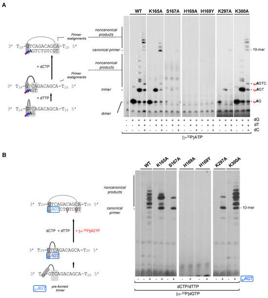 Next, we further explored whether these 3′ incoming dNTP ligands are important during all nucleotide incorporation cycles, or if their importance is restricted to the initial steps of priming (preternary complex leading to dimer formation), described as the bottleneck of the priming reaction [1,11]. To avoid the need for de novo dimer synthesis, a synthetic mini-primer with three phosphates in the initial ribonucleotide (3pAdGdT) was used as an ab initio substrate [11], thus mimicking a natural HsPrimPol nascent primer. This pre-formed trimer was used in combination with the 60-mer heteropolymeric template previously described, and elongated with dTTP, dCTP and [α-32P]-labeled dGTP (see the scheme shown in Figure 4B). As expected, WT HsPrimPol elongated 3pAGT efficiently up to the end of the heterologous sequence template (10-mer) preceding the polyT tail (dA is not provided), but also producing longer non-canonical products likely due to backwards primer realignments (Figure 4B). When K165A and K300A mutants were analyzed, they also yielded 3pAGT-elongated products, in amounts similar to those produced by WT HsPrimPol. It is worth mentioning that the K165A mutant again produced a reduced number of non-canonical products. As predicted, the S167A and K297A mutants were able to extend a significant amount of the pre-formed 3pAGT trimers, but the non-canonical products were also decreased in these two mutants. Therefore, the initial synthesis of dimers appears to be the step most affected in both S167A and K297A mutants, implying that Ser167 and Lys297 are especially relevant in stabilizing the preternary complex (enzyme:ssDNA:dNTP), which precedes the binding of the 5′ nucleotide and subsequent dimer synthesis. The altered balance of canonical vs. non-canonical products synthesized by K165A, S167A and K297A mutants compared to the WT PrimPol suggests that Lys165, Ser167 and Lys297 are required for primer realignment-mediated dNTP incorporation [12,34], enabling PrimPol to carry out TLS primase activities [33]. Interestingly, neither H169A nor H169Y showed any extension of the trimer (3pAGT), leading to the conclusion that His169 is also crucial for 3′ dNTP binding during primer elongation.