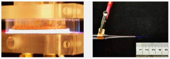 Two sources of LTP: dielectric barrier discharge (DBD) in argon driven by repetitive short duration (ns–µs) high-voltage pulses (left); a micro-jet using helium as operating gas, generating a cold plasma plume about 2.5 cm in length (right). Reproduced from Laroussi M, Cold plasma in medicine and healthcare: The new frontier in low temperature plasma applications. Front. Phys. 8:74. doi:10.3389/fphy.2020.00074 under the terms of the Creative Commons Attribution License (CC BY) [2].