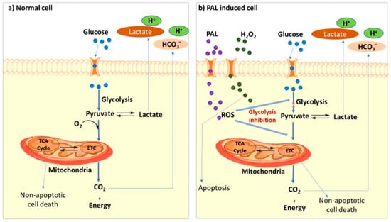 Pathways for inhibition of glycolysis and tricarboxylic acid (TCA) cycle and electron transfer chain (ETC) by plasma-activated Ringer’s lactate solution (a). Extracellular H2O2 induces apoptosis and non-H2O2 PAL components induces non-apoptotic cell death (b) [76,85].
