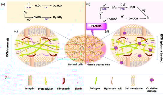 (a) Catalase (CAT) and superoxidase dismutase (SOD) catalyzed cell signaling pathways in normal (cancer) cells, (b) HOCl and ONOO− pathway in plasma-treated cells, (c) representation of an extracellular matrix of normal (cancer) cells (d) plasma-treated ECM under oxidative stress, (e) components of extracellular matrix. Reproduced from Privat-Maldonado, et al., Modifying the tumor microenvironment: Challenges and future perspectives for anticancer plasma treatments. Cancers 2019, 11, 1920 [87] under the terms of the Creative Commons Attribution License (CC BY).