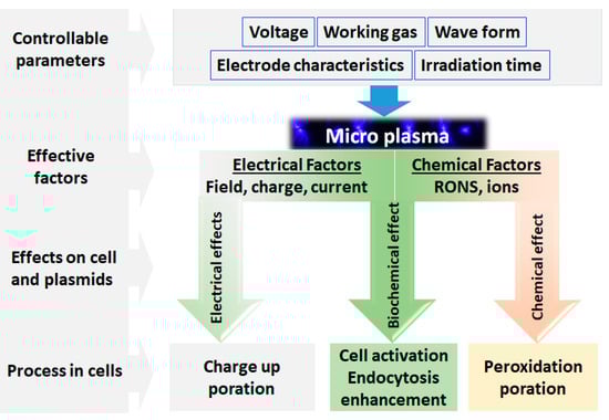 In 2016, Jinno’s research group studied the plasma-induced electrical and chemical factors in the process of gene transfection, which is a method of introducing foreign nucleic acids into eukaryotic cells in order to change the genetic composition of the host cell. They have used three experimental tools to analyze the effect of plasma induction: (1) a laser-produced plasma to investigate the chemical factors, (2) plasma irradiation on artificial cells like liposomes to evaluate the gene transfer, and (3) evaluating the endocytosis effect to analyze the biochemical changes. Based on the results, it was clear that RONS do not work alone for the process of gene transfection without electrical parameters such as electrical current, electrical charge and electrical field. According to the results of plasma induction on liposomes, under the condition without biochemical reactions, the process of plasma gene transfection occurs through endocytosis and electrical poration and not by the permeation through ion channels or chemical poration. A conceptual diagram of the factors affecting plasma gene transfection is depicted in Figure 4 [124].