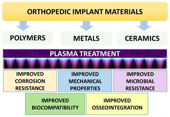In addition to other medical procedures, LTP can be used to prepare or enhance surfaces such that they are medically biocompatible, such as functionalizing implant surfaces. Orthopedic surgeons are particularly interested in the concept of osseointegration, which is the direct organizational adaptation of bone to the implant [142]. Surface modifications may improve the osseointegration of implants and can influence the success or failure of reconstructive surgery depending on the amount of bone anchoring on the implant surface [143]. Protein adsorption is regarded to be the first step in osteointegration, which then attracts osteoprogenitor cells to the implant surface. In order to create a favorable microenvironment on the implant surface, it is possible to manipulate the surface features of the implant such as charge, texture, and polarity to increase cellular adherence [144,145]. A material’s capacity to promote osseointegration is frequently assessed by looking at its surface energy, which is a measurement of unbonded surface atoms. Cellular adhesion is promoted by states with high surface energy [146,147]. As it has been proved that surfaces with a moderate degree of roughness outperform surfaces that have been turned, current research focuses on other modifications that could potentially boost the bioactivity of the implant. To induce coactive effects, some recent experiments have resorted to chemically altering somewhat abrasive surfaces [148]. A number of different materials are being used as orthopedic implants that can improve their properties by the application of LTP treatment (Figure 5).