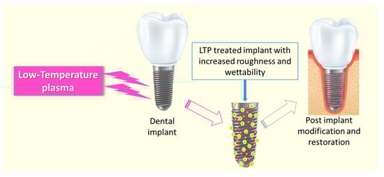 Schematic representation of the LTP-based dental implant modification. Adapted and modified from Lata et al. Aurora Borealis in dentistry: The applications of cold plasma in biomedicine. Mater. Today Bio 2022, 13, 100200. [187] with copyright permission from Elsevier.